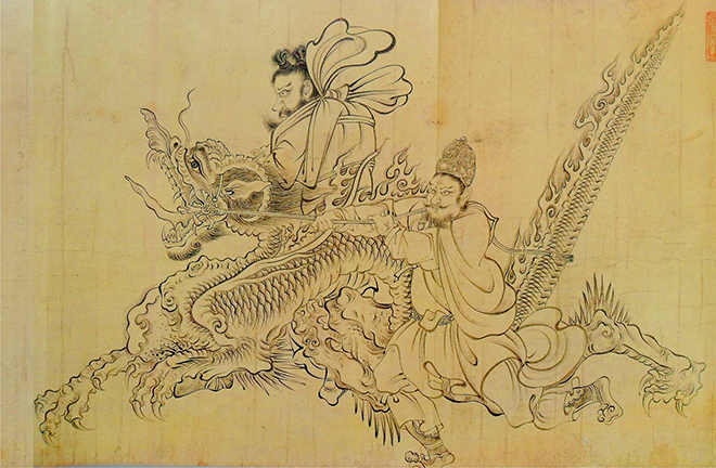 Pre-Qin era paintings featuring dragons are quite rare, and are mostly characterized by abstract drawings and simple lines. Two silk paintings by unknown late Warring States Period (475–221 BCE) artists unearthed at Changsha, Hunan Province, respectively depicting a man riding a dragon, and a lady with a dragon and a phoenix, are the earliest known dragon paintings discovered to date. The theme of “riding a dragon” has been a popular motif in traditional Chinese art. According to Shiji, after completing the production of a bronze ding vessel [a symbol of authority], the legendary Yellow Emperor rode a dragon to ascend to Heaven [at the end of his life]. The location of his ascension to Heaven was called “Ding Hu,” thus the Chinese idiom “Long Qu Ding Hu” [lit. a dragon left Ding Hu] refers to the death of the emperor.