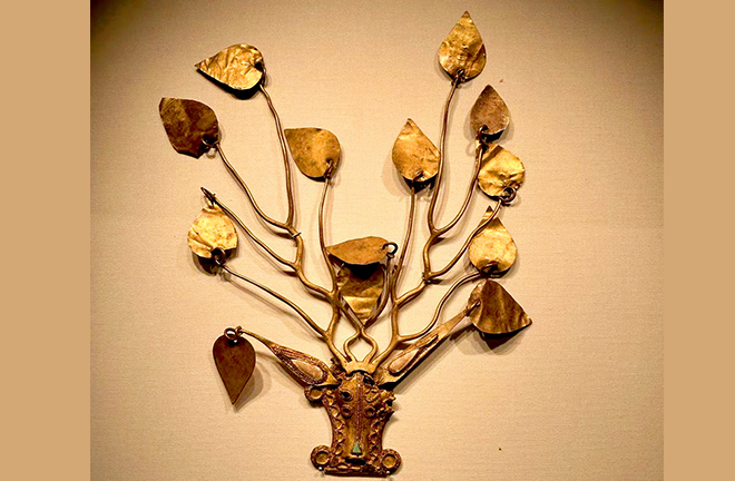 During the Jin (266–420) and Sixteen Kingdoms (304–439) period, an ethnic Xianbei tribe known as Murong and the Han people who assimilated into the Xianbei society established the Former Yan (337–370), Western Yan (384–394), and Later Yan (384–409) regimes at present-day Chaoyang, Liaoning Province. Its capital emerged as a vital hub marking the eastern origin of the Steppe Silk Road during that era. Numerous gold and silver artifacts discovered within this area showcased borrowed elements of Central Asian and West Asian cultures, represented by the buyao [lit. shake as you go] crowns. This type of headwear originated from Darouzhi [a nomadic tribe originally living in Northwest China, and moving westward after being forced by the powerful Xiongnu] after they migrated westward to Central Asia. Similar headwear was also found at the Tillya tepe of Afghanistan. The buyao crown was introduced to China during the Eastern Han period.