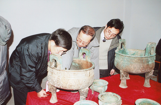 Li Xueqin (second from right) interpreting the inscriptions inside a Lai Ding vessel from the Western Zhou Dynasty Photo: Courtesy of ZHANG MAORONG