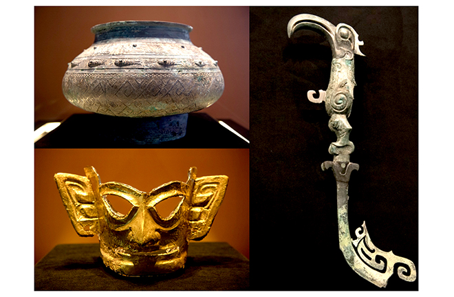 The newly exhibited bronze bu jar (upper left), the gold mask (lower left), and a branch of the second bronze divine tree (right) at Sanxingdui Museum Photo: XINHUA