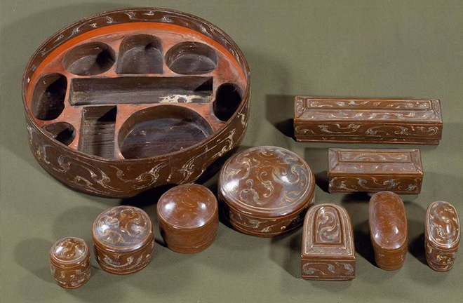 Dressing cases, first crafted and used as early as the Warring States Period, were in use until the late Qing and early Republican eras. These finely crafted boxes stored precious items for women, such as bronze mirrors, mirror covers, combs, rouge, lip colors, face powder, eyebrow pigment, false hair, mirror brushes, powder puffs, fragrances, and even jewelry. A notable example is the “Jiuzi Lian Case” unearthed from the Mawangdui Han Tomb No. 1, which was discovered wrapped in silk. The upper compartment contained gloves and ribbons, while the lower compartment held nine smaller cases in various shapes (rectangular, round, oval, and hoof-shaped). These smaller cases were used to store cosmetic products such as face powder, combs, false hair, and powder puffs.