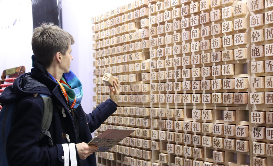 A foreign participant looks at a Chinese character taken from a Chinese character wall during the 12th Confucius Institute Conference that was held from Dec. 12 to 13 in Xi'an, capital of Northwest China's Shaanxi Province. (PHOTO: WWW.CNR.CN)