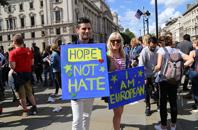 Thousands of people in London attended the “March for Europe” Brexit protest in early July 2016, shortly after the Brexit referendum on June 23. However, doubts about European integration remain, inhibiting the EU’s recovery. Photo: JIANG HONG/CSST