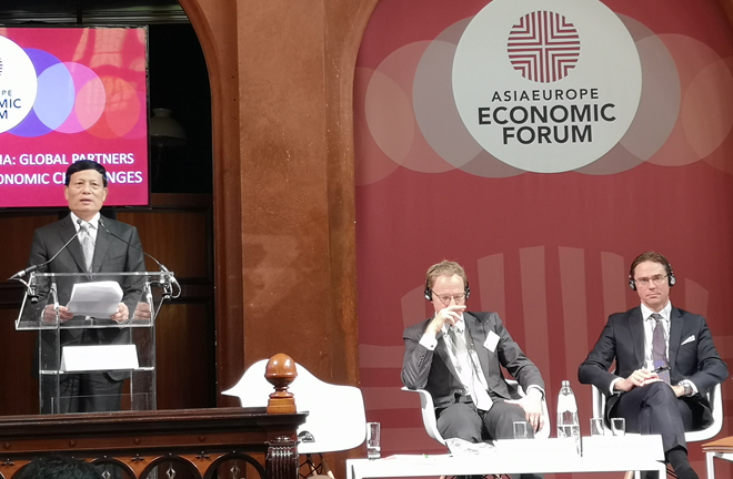 Brussels—Under the theme “Europe and Asia: Global Partners for Global Economic Challenges,” the 15th Asia Europe Economic Forum (AEEF) took place Oct. 17–18 in conjunction with the 12th ASEM Summit, which took place Oct. 18–19 in Brussels, Belgium. The AEEF serves as a high level platform, giving Asian and European policy makers and economic experts an occasion for in-depth research-based exchanges on global issues.
