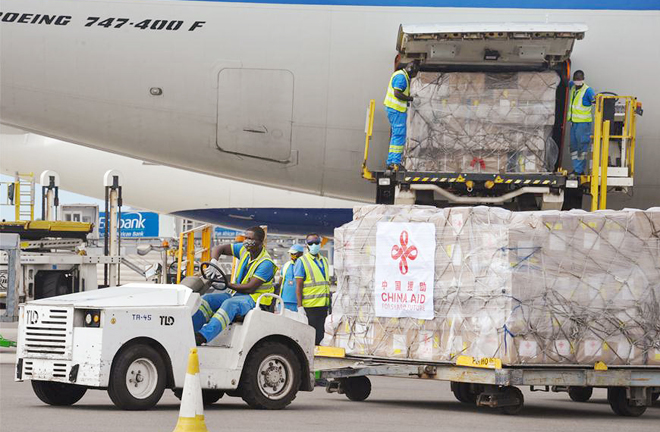 Staff unload Chinese medical supplies from an airplane at Kotota International Airport in Accra, the capital of Ghana, April 6. China’s medical supplies for 18 African countries arrived there on Monday and are scheduled to be delivered to the other 17 countries within a few days. Photo: Xu Zheng/XINHUA