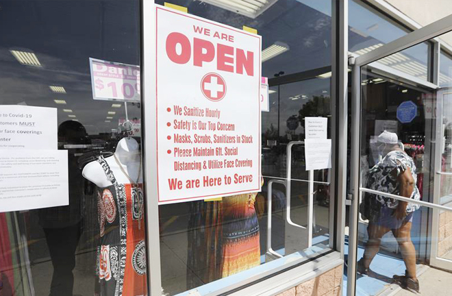 A customer walks into a costume shop in Nassau County of Long Island, New York, May 27. Long Island’s start of the first phase of reopening leaves New York City the only region remaining under the “PAUSE” order in New York State. Photo: Wang Ying/XINHUA