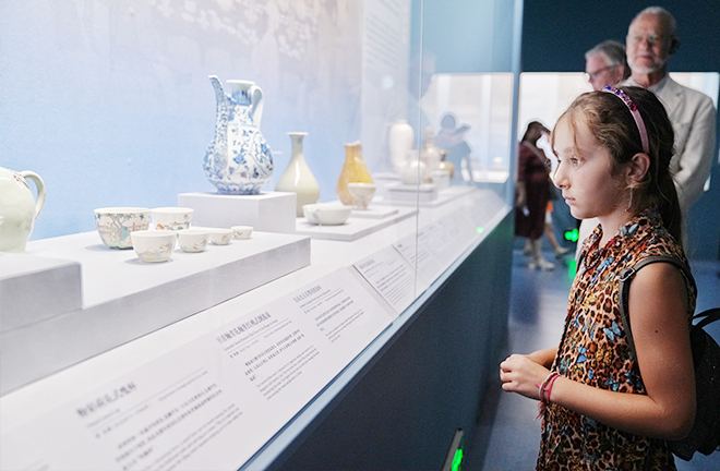 A girl learns about Chinese porcelain at the National Museum of China during the Global Civilizations Dialogue Ministerial Meeting. Photo: IC PHOTO