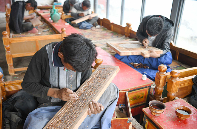 Woodcarving artisans at work in Nyêmo County, Lhasa Prefecture of the Tibet Autonomous Region in May, 2022. Photo: CFP
