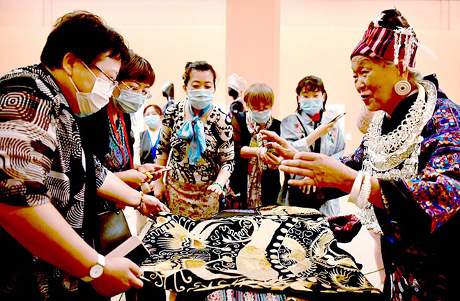 Pan Yuzhen, a 77-year-old embroiderer, describes her hand-embroidered Miao garments to visitors at the National Art Museum of China. Photo: CFP
