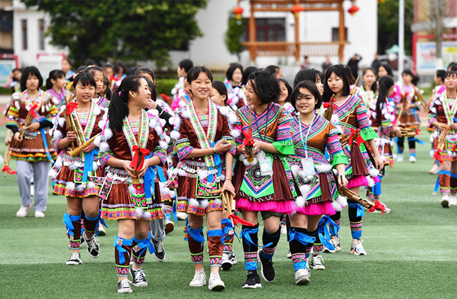 Middle school students in Rongshui Miao Autonomous County, Guangxi Zhuang Autonomous Region walked to classrooms after playing reed-pipe wind instruments. These students gained a change of studying at schools in and near resettlement, avoiding an arduous trek back and forth in mountains. Photo: Huang Xiaobang/XINHUA.