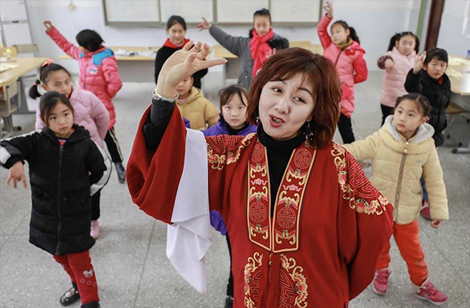 A performer teaches students Huangmei Opera at Gusang Primary School, in Xuyi County, Jiangsu Province, Dec. 16, 2018. Photo: XINHUA