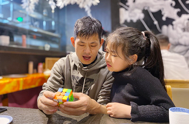 A father teaches his daughter to solve a Rubik’s cube at a restaurant in Beijing in February 2021. Photo: Chen Mirong/CSST