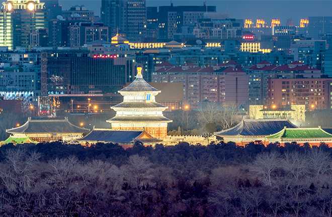 Traditional architecture at the famed Temple of Heaven shines brightly against modern buildings in Beijing’s night skyline. Photo: TUCHONG
