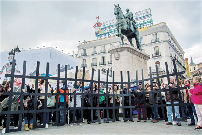 In Madrid, capital of Spain, on April 23, people protest the EU-Turkey agreement on the repatriation and relocation of refugees.