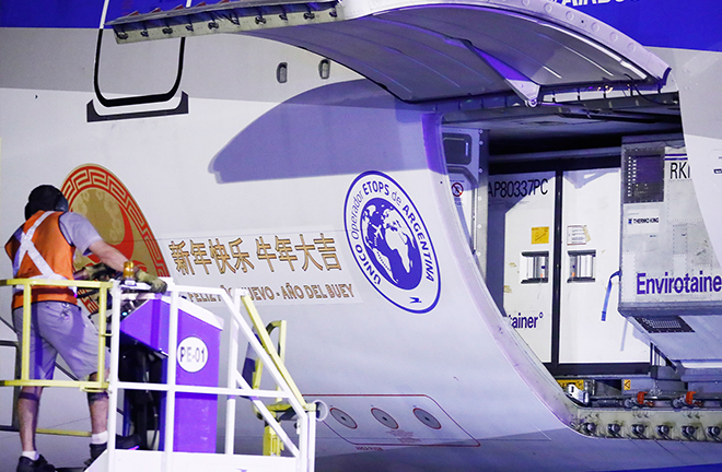 An Airbus 330-200 carrying 904,000 doses of Sinopharm vaccines from China arrives at Ezeiza International Airport on Feb. 25, 2021, in Ezeiza, Argentina. Photo: CFP