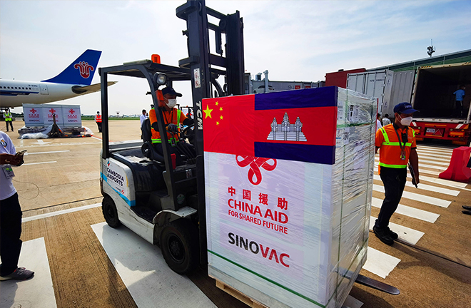 Staff members transfer the seventh batch of COVID-19 vaccines from China at the Phnom Penh International Airport in Cambodia on Nov. 17, 2021. Promoting COVID-19 vaccines as a global public good is part of China’s efforts to practice the shared human values. Photo: CFP