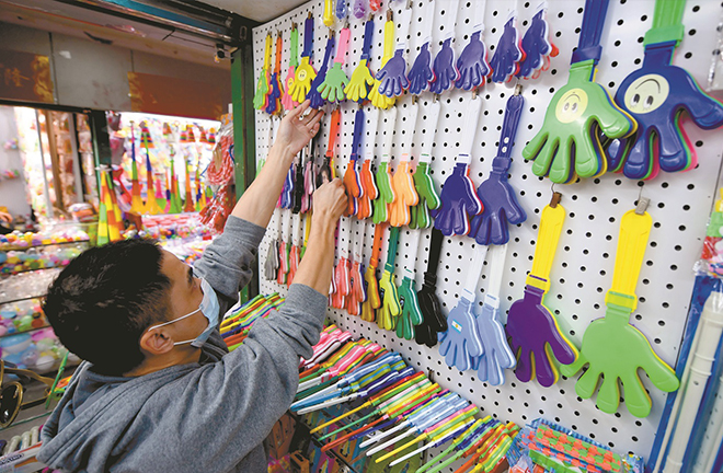 A businessman arranges hand clappers at his export stall in the Yiwu International Trade Mart. Photo: CFP