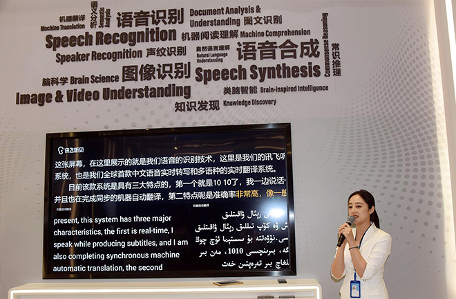 A staff from Iflytek introduces its speech recognition and translation technology. Photo: CFP