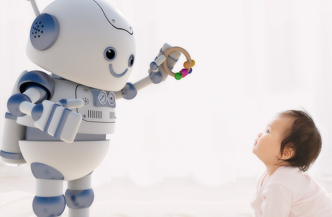 An infant interacts with a toy robot. Photo: TUCHONG