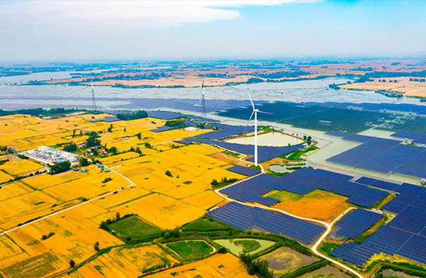Windmills stand in the middle of wheat fields and photovoltaic fields in Sihong County, Jiangsu Province, on May 27, 2021. Photo: CFP
