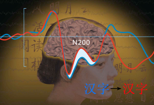 In the experiment on the brain’s response to Chinese characters, we can observe a unique centro-parietal N200 response. This N200 response shows a clear and large amplitude enhancement upon word repetition. The discovery of the centro-parietal N200 reflects that visual analysis appears early in the identification of the orthography of Chinese characters.