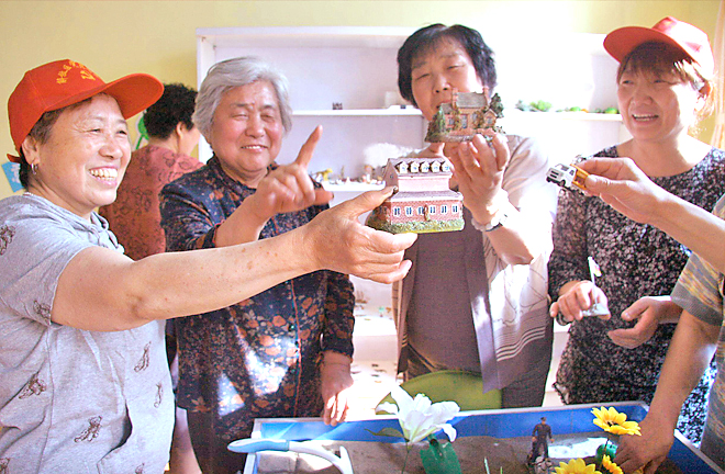 Residents participate in a sandbox game at the community recreation center for seniors in Jiaozuo, Henan Province.