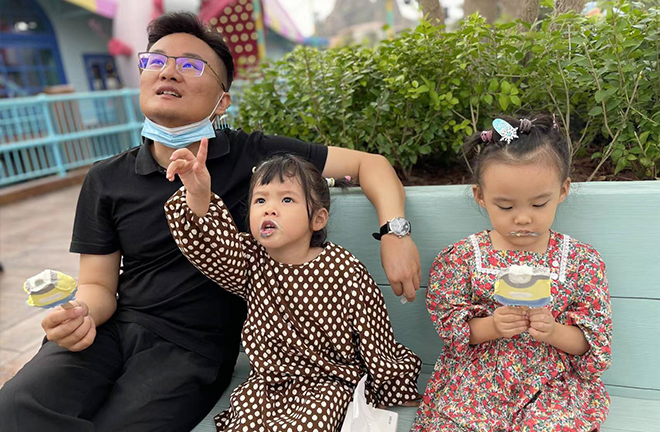 A dad enjoys quality time with his daughters at Universal Beijing Resort. Photo: Weng Rong/CSST