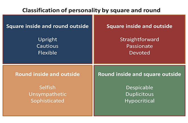 Internally round and externally square people feature a rotten interior beneath a fine exterior. They are sometimes described as decent and solemn in appearance, yet excessively selfish within. They can be impassioned gentlemen in public, but do horrible, despicable things in private. They say one thing but do another, thus are highly hypocritical. If they obtain a post within the government, their subordinates and colleagues will suffer. In front of interests, they are shameless.
