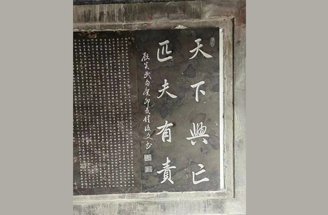 FILE PHOTO: A tablet inscription, titled “The Survival of a Nation is the Responsibility of Every Individual,” at the Baoguo Temple in Xicheng District, Beijing