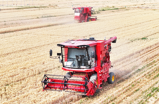 Driverless harvesters reap wheat on a farmland at the Yangping Smart Agriculture Demonstration Zone in Jishan County, Shanxi Province, on June 10. Photo: IC PHOTO