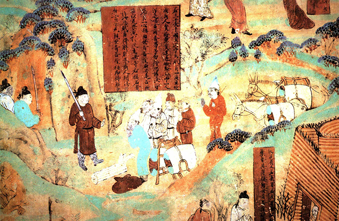 In the Mogao Caves, two murals known as the “Buddhist Illustration of the Field of Merit” in Cave 296 (Northern Zhou Dynasty) and Cave 302 (Sui Dynasty) depict scenes of commercial activities on the ancient Silk Road.