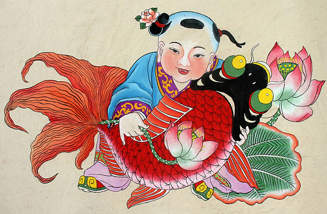 Another hallmark of Wuqiang New Year pictures is their exaggerated style, particularly in depicting figures. Facial expressions are highly expressive, with emotions such as joy, anger, sadness, and happiness conveyed through subtle changes in the eyes and features. Enlarged heads enhance the clarity of these emotions, making the characters more vivid and engaging. The vivid and captivating nature of Wuqiang New Year pictures comes from this focus on detail. In “The God of Wealth and Good Fortune,” Bi Gan is portrayed with a calm, benevolent gaze, radiating warmth and approachability. In “Welcoming Spring,” a child’s crescent-shaped eyes sparkle with delight as they play with toys, firecrackers, and kites. Animal-themed pictures further exaggerate auspicious imagery. In “Year after Year of Abundance,” a chubby baby holds a goldfish, whose scales and tail fin are meticulously detailed. The fish, occupying the diagonal of the painting and appearing even larger than the baby, emphasizes the word yu (fish), which sounds like “abundance” in Chinese. This visual play reinforces the wish for surplus, prosperity, and good fortune in the coming year. This picture conveys the notion that there should always be surplus in everything—be it in celebration or provisions.