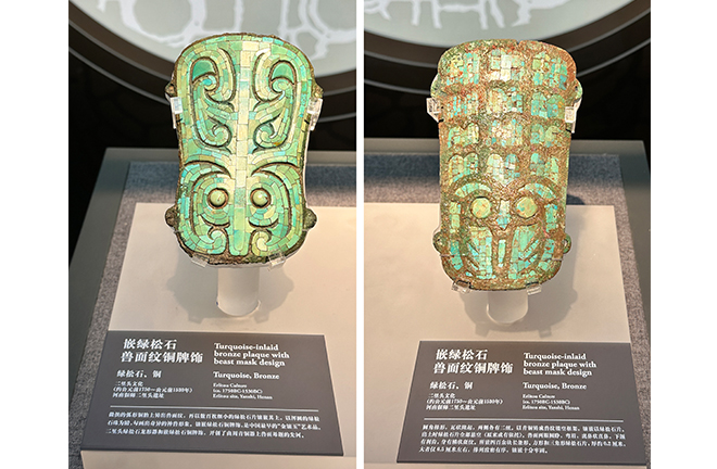 Among the nearly 20 bronze plaques unearthed from the Erlitou culture, all feature beast-mask motifs inlaid with turquoise. The intricate and symmetrical designs demonstrate sophisticated inlay craftsmanship. Two decorative approaches are evident: one where the motif is framed by raised bronze lines, with rectangular turquoise pieces arranged in neat rows; and another where the motif is outlined with bands of turquoise inlay, with the turquoise pieces cut into various shapes and arranged into curved, broad bands, forming the beast mask and horns.