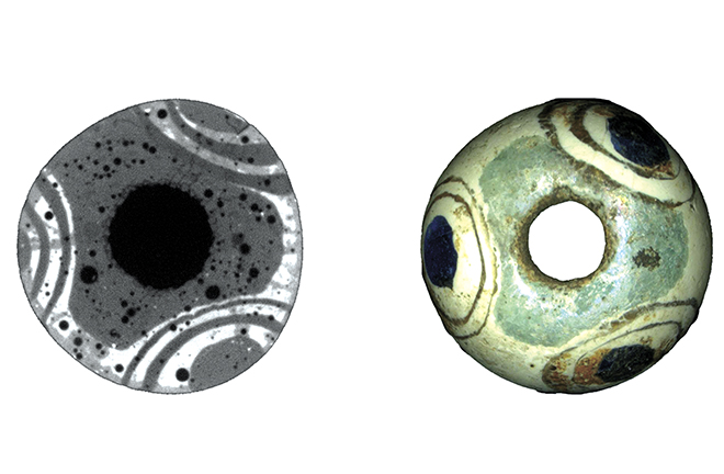 CT scans (left) and physical specimen (right) of a dragonfly-eye glass bead unearthed in Xinjiang Uygur Autonomous Region Photo: PROVIDED TO CSST